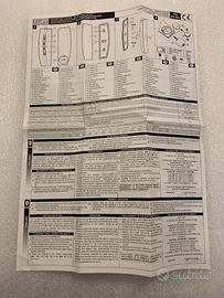 Trasmettitore radio a 433,92 Mh ed infrarosso a 4 tasti in gomma siliconica illuminati di color blu, alimentato a 6 V tramite due batterie a bottone. Il trasmettitore è dotato di supporto per il fissaggio a parete. con foglio manuale istruzioni.