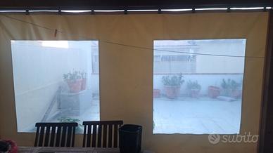 2 teloni in Pvc, impermiabilizzati . Da esterno. Un telo con 2 finestre . Un telo con una porta a cerniera e una una finestra . I teli sono scorrevoli e completi di accessori x il fissaggio (laterale/superiore/inferiore). Lunghezza 3,95/4 metri ciascuno