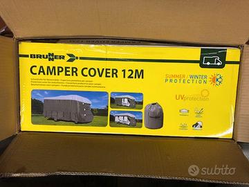 Copertura per camper in tessuto TNT antigraffio a 4 strati, traspirante ed idrorepellente, resistente ai raggi UV, per la protezione del mezzo da fattori esterni quali pioggia, sole, polvere, inquinamento chimico, escrementi animali, foglie, ecc.. Cover adatta sia in estate che in inverno. Marca Brunner, adatta per camper lunghi da m. 6,50 a 7,00. La copertura è dotata di robuste cinghie di fissaggio antivento, con fibbia tensionatrice, e di cerniere laterali che permettono un comodo accesso al mezzo quando coperto e che facilitano notevolmente le operazioni di copertura. Comprensiva di sacca per la custodia. Il telo è nuovo, ancora imballato, perché nel frattempo sono riuscito a realizzare una struttura fissa per il ricovero del camper. Le immagini pubblicate quindi sono quelle tratte dal sito della ditta produttrice.