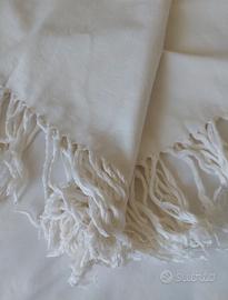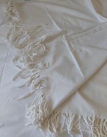 Telo copridivano copriletto tenda cotone bianco panna, con frange. Misura extra grande. Puo' essere copridivano, copriletto o tenda ma NON è trasparente. Cotone spesso e resistente. Dimensioni 250cm, 192 cm. Con finitura cimosa come mostrano le foto. Le frange sono lunghe circa 15cm