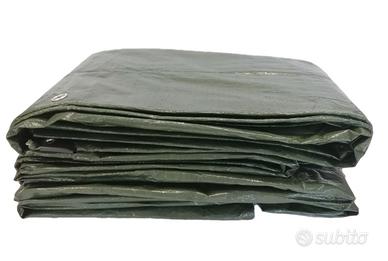 Telo occhiellato 115 g/m² in polietilene multiuso, resistente alle basse temperature, impermeabile, resistente agli strappi, occhielli robusti in metallo, angoli rinforzati, cordino perimetrale, colore unico verde/blu.