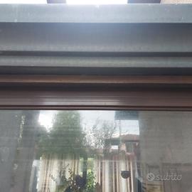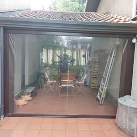 tenda avvolgibile in pvc trasparente per veranda. montata su telaio marrone, avvolgibile manualmente con manovella. installazione fissa con blocchi a pavimento per mantenere la tensione dim. largh. 280 x h 192