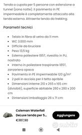 Vendo tenda da campeggio marca Coleman modello waterfall 5 Deluxe , 5 posti, usata una sola volta. Pari a nuovo. Nuova costa 387 euro. Preferisco non spedire.