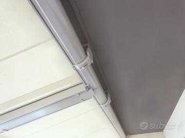 Vendesi tenda avvolgibile da esterno telecomandata del marchio Stobag di lunghezza 11.70m, larghezza 3.45m, altezza variabile (come da sezione in foto) composta dalla tenda principale di copertura e da due tende laterali di chiusura verticale. Il tutto è telecomandato. La struttura è suddivisa in 3 campate indipendenti.