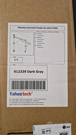 Larga circa 140cm e alta da 2,7 a 3,05m circa , tenda tessuto tecnico color antracite (grigio scuro) con pali e struttura bianca.