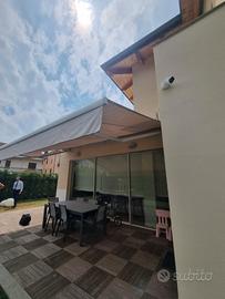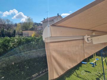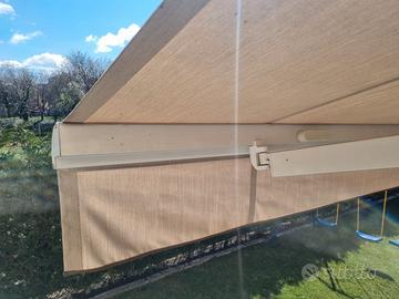 Tenda da sole a bracci estensibili motorizzata con telecomando, misure cm. L600xP400, tessuto acrilico colore ecru, leggermente macchiato ma totalmente integro, con pendente frontale. Struttura in alluminio verniciato bianco con cassonetto.