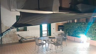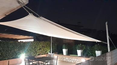 Tende da sole a vela in parte sovrapposte in due colori (Beige chiaro e Beige Scuro)di alta qualità con design accattivante. Attacchi da un lato a muro/soffitto e dall'altro con pali (alu-simple) ad alta resistenza regolabili. Dimensioni per l'istallazione cm. 500x500 circa. Fornitura completa con vele accessori kit tiranti, kit fissaggio e viti. Valore dei pali al nuovo €. 310,00 + iva cad. uno.