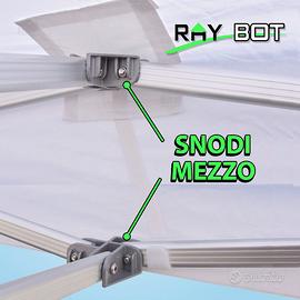•Telo in PVC 850D: 350 g/m², impermeabile al 100%, anche con piogge forti e prolungate. Trattamento idrorepellente e anti-UV.