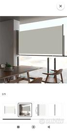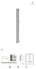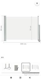 Tenda laterale retrattile 80x300, semplice ma elegante per terrazze, patio o balcone, protegge dal vento o dal sole e garantisce allo stesso tempo la privacy. Lo schermo è realizzato in poliestere resistente ai raggi UV ed agli strappi. Nuova mai usata ancora nella sua scatola originale, facile da montare.