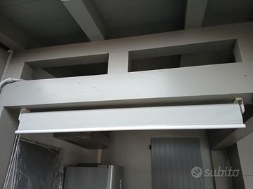 Tenda ombreggiante a rullo con tessuto da esterno grigio chiaro e catenella per il movimento.Tessuto integro,presenta qualche piccolo segno d'usura.