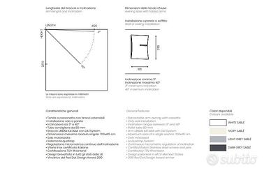 Vendo tenda solare a bracci, motorizzata e cassonata, modello Shan Shadelab, struttura in alluminio estruso con componenti Inox color avorio, staffaggio a muro, profilo quadrato, verniciatura con polveri epossidiche resistenti ai raggi UV ,movimentazione automatizzata con radiocomando, color avorio con tenuta alla pioggia resistente a venti moderati. Dimensioni Largezza 4 mt, sporgenza 3m, tot mq 12. Prezzo leggermente trattabile se veramente interessati.