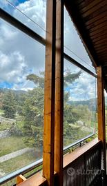 Tenda a caduta guidata, azionamento ad arganello, telo in pvc cristal trasparente.