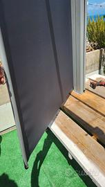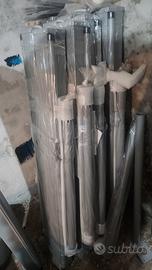 tenda colore grigio scrorrevole orizzontala 3m per lato altezza 1,10m totali 9 pezzi di cui 8 ancora imballati mai utilizzati. Possibilita di orientare le tende per creare angolo o linea retta di 6m. Completo kitndi montaggio e paletto blocca tenda