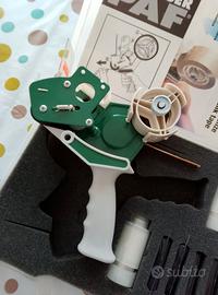 Kit professionale PAF dispenser tendinastro manuale con marcatore •Funzione: Permette di applicare il nastro adesivo e, grazie a un meccanismo integrato, stampare una scritta personalizzata sul nastro stesso durante l'applicazione. •Materiali: costruito con un telaio resistente, spesso in metallo e plastica rinforzata, con un'impugnatura ergonomica. •Utilizzo: Ideale per operazioni di imballaggio medio-piccole, sigillatura e personalizzazione dei colli. 🛠️ Componenti del Kit Il set include diversi elementi organizzati in una custodia protettiva: •Dispenser manuale: L'attrezzo principale con impugnatura a pistola. •Rulli per inchiostro: Cilindri bianchi che servono per applicare il colore sui caratteri. •Timbri/Caratteri: Elementi in gomma intercambiabili per comporre il testo desiderato. •Manuale d'istruzioni: Documentazione che spiega come caricare il nastro e configurare la stampa. 💡 Funzionamento Il modello integra un meccanismo di marcatura: 1.Si inserisce un rotolo di nastro neutro. 2.Si montano i caratteri o i loghi sul rullo di stampa. 3.Mentre si srotola il nastro per sigillare un pacco, il rullo inchiostrato stampa il testo sulla superficie adesiva o superiore. 4.Permette di creare nastri personalizzati "sul momento" per sicurezza, identificazione o branding.