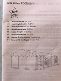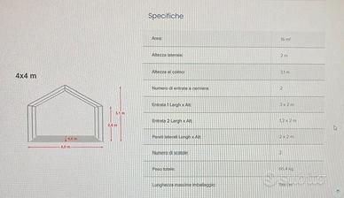 Tendone Gazebo 4x4 , marca Toolport (Germania) - distribuzione Tendapro. Praticamente nuovo, usato solo una stagione sotto un porticato per coprire una vasca idromassaggio. Aperture finestrate e due laterali di 3,00 e 1,20 m. Molto resistente: teli in PVC 700, telaio in tubi d'acciaio zincato 40mm. Ritirabile a Viterbo o spedizione da calcolare, a carico dell'acquirente.