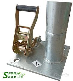 Il telo è in pvc da 150MC resistente e impermeabile dalla lunga durata , viene fissato alla struttura tramite delle clip ad anello e a terra con delle barre in acciaio agganciate a dei tiranti su ogni piastra.