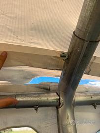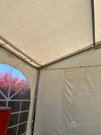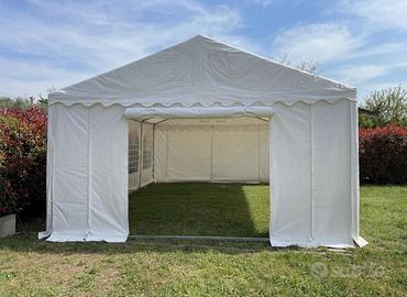 É la versione migliore del tendone della marca TOOL PORT comprato su tenda pro un anno fa, costo di acquisto 1595€ (verificabile cercando il titolo dell’annuncio sul loro sito) ho preso la versione antivento, ignifuga, più resistente, perfette per feste, eventi, rimessa, isolante. con le seguenti caratteristiche: Estremamente stabile: grazie al triplo rinforzo aggiuntivo del tetto e agli angoli rinforzati Telaio a pavimento aggiuntivo per una maggiore stabilità Robusto telone in PVC 1400 grazie alla trama intrecciata Ritardante di fiamma *22 (Classe B, EN 13501-1) Altezza extra comfort: altezza laterale 2,6 m E dotato di 4 teli laterali sostitutivi totalmente bianchi, quindi in totale ci sono 12 teli muro, di cui 4 mai utilizzati. Il tendone presenta uno strappo all’apice di una colonna, che è possibile innanzitutto ricucire, ma che non compromette le prestazioni e non influisce sull estetica. Sono presenti in dotazione anche i picchetti antivento lunghi 60 centimetri e diameteo 4 centimetri. Vendo perche dobbiamo rifare le piante dietro il tendone e siamo impossibilitati a spostarlo altrove sul terreno