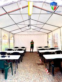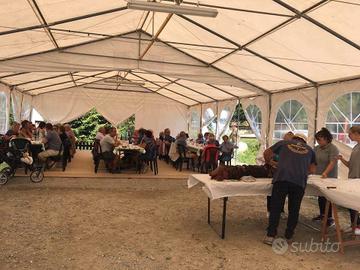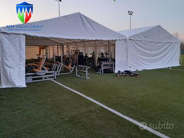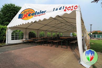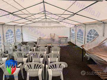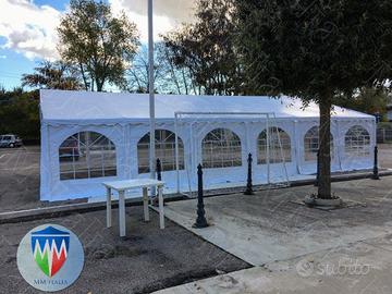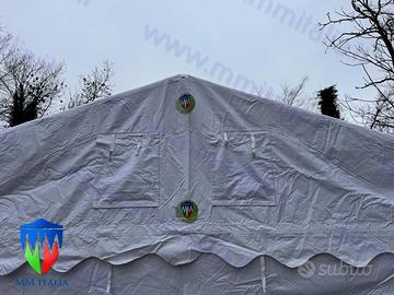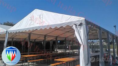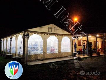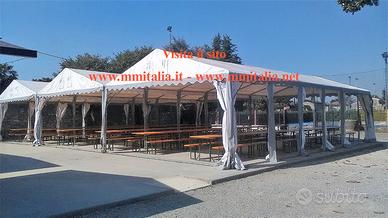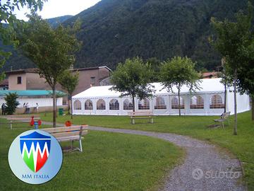 LINEA MARZIA VELCRO WINTER TENDONE, TENDOSTRUTTURA 6 X 12 X 3.00 METRI ADATTI PER USO INVERNALE Modello Bianco Finestrato Peso struttura 286 kg TRASPORTO A PREVENTIVO Struttura di ottima qualitá con telo in Pvc Ignifugo, 550 gr. Mq. con Certificazioni Europee, adibito per uso Pubblico, TELO Il tetto, in PVC IGNIFUGO CERTIFICATO, PER USO PUBBLICO DI BEN Gr 550 Certificazione Ignifuga Europea, e resistenza al fuoco del PVC, testato: DIN 4102 -B1 / B2 Il telo internamente e´con rete antistrappo, che lo rende super resistente alla trazione Simile ai teloni dei camion. Il telo, in gronda e provvisto di merletti,che gli danno un tocco di classe. II telo del Tetto si fissa con pratici elastici, da ambo le testate del tetto ci sono 2 finestrelle per la ventilazione Le Pareti finestrate, sui lati verticali, abbiamo applicato il velcro, innovativo, che facilita aperture e chiusure delle pareti senza dover allacciare sempre gli elastici, e nello stesso tempo chiudere perfettamente da spifferi di vento e acqua e poterlo riscaldare in Inverno. ATTENZIONE LA STRUTTURA IN GRONDA E´ALTA 2,00 METRI !!!!!!!!!!!!!!!!!! PANNELLI LATERALI I pannelli laterali, si applicano con elastici, tra gli occhielli e il telaio, e hanno applicato anche il velcro, per proteggere totalmente dagli spifferi, e dare la possibilitá di aprire e chiudere senza dover sempre... allacciare e slacciare gli elastici. esempio ? avete il tendone 6 x 12 mt. tutto aperto ? sta per arrivare un temporale ? srotolate le pareti e schiacciate il velcro tra di loro, 1 persona in 5 minuti tutto chiuso,, poi altri 5 minuti per riaprire Si possono predisporre passaggi di entrata e uscita da qualsiasi finestra Tutte le pareti perimetrali,si possono Velocemente aprire, arrotolandole , a ventaglio, oppure toglierle. TELAIO La struttura del telaio e´in acciaio zincato a caldo, Ø 38 mm. BULLONI PASSANTI