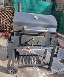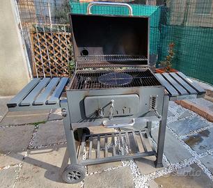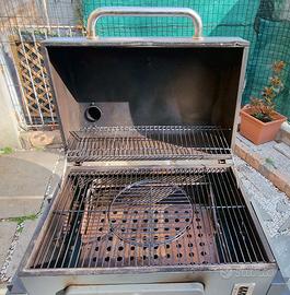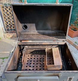 Vendo per passaggio a dispositivo a Pellet. Superficie griglia circa 71,5 x 46 cm, superficie di riscaldamento/cottura circa 67 x 24 cm regolabile in 6 differenti altezze, griglia di cottura divisa in 3 parti di cui 2 griglie laterali ciascuna di circa 35 x 46 cm e una centrale tonda, 2 ripiani laterali richiudibili, altezza di lavoro circa 90 cm, guaina isolante applicata su base d’appoggio e coperchio. Da utilizzare esclusivamente con carbonella o bricchetti di carbone. Corredato di Slower e copertura che permette di lasciare i 2 ripiani aperti.