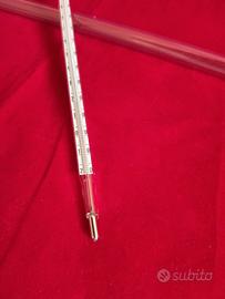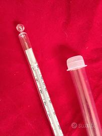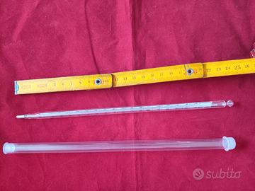 Termometro in vetro a colonna liquida, scala –15°C / +150°C, ideale per misure tecniche, enologiche o da laboratorio. Corpo in vetro con scala stampata ben leggibile e bulbo inferiore. Lunghezza totale circa 26 cm. Completo di custodia rigida trasparente con tappi. Condizioni ottime, strumento preciso e pronto all’uso. disponibili 6 pezzi