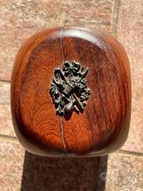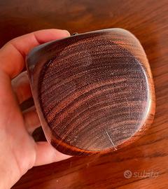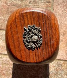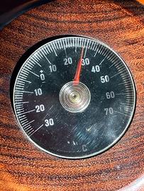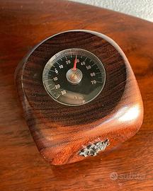 Termometro da scrivania vintage in legno a forma di cubo. Presenta piccole placchette metalliche sui quattro lati, disposte a coppie, che raffigurano fiori, strumenti musicali, nastri ecc. Sulla parte superiore si trova il termometro vero e proprio: la scala utilizzata è quella Celsius, la cupola non è in vetro ma in plastica. Su un lato presenta una crepa naturale nel legno (visibile in foto) perfettamente chiusa che non ne compromette l'estetica. Misura circa 8 cm per lato e pesa 350 g.