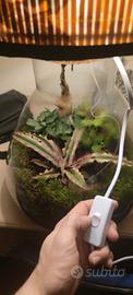 Vendo bellissima lampada terrario artigianale ( pezzo unico ) ispirata alla grande foresta amazzonica con piante originarie del sud America, lampada e 27 wifi luce calda integrata nel tappo e paralume in fibra di bambù con stampa esotica .