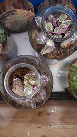 Vendo terrari artigianali realizzati a mano, con piante subtropicali selezionate: fittonia, muschi vivi, pilea, peperomia e substrato professionale a strati per una lunga durata.