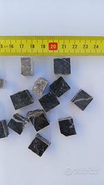 Tessere per mosaico in marmo Grigio Carnia, 4 lati tranciati, circa mm 15 per 15 spessore 10 mm. Confezioni da 500 g, consumo stimato circa 23 kg/mq. Disponibili altri colori.