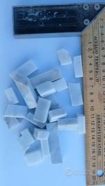 Tessere e listellini per mosaico in marmo di Carrara, spessore mm 10, varie misure, taglio sega e trancia. Un lato lucido, mix di Carrara chiaro e scuro. Confezioni da 500g. Disponibili più confezioni.