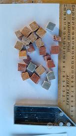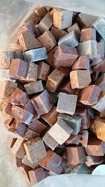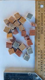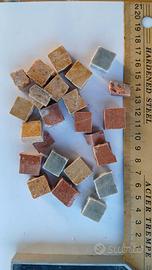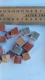 Tessere per mosaico in marmo, miscela di vari marmi: Verde laguna, Rosso alicante, Travertino giallo e Giallo Reale. 4 lati tranciati a mano, misure circa mm 15×15×10 di spessore. Superficie opaca, disponibile 1 kg circa di materiale.
