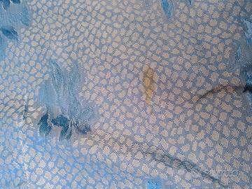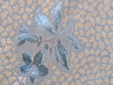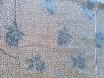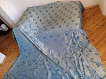 Propongo questo copriletto anni '70 per progetti creativi/upcycling, il tessuto e' verosimilmente in viscosa o poliestere o un mix tra i due, colore azzurro carta da zucchero cangiante oro/argento con ricami floreali. Me lo immagino molto bello per pochette, borse, cuscini e complementi d'arredo in genere. Perfetto comunque anche per la destinazione originaria, un copriletto matrimoniale in stile. misure: 230 cm x 255 cm questo la piu' lungo ha una bella passamaneria con frange. Segnalo una piccola macchia di circa 1 cm, altrimenti in ottime condizioni