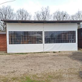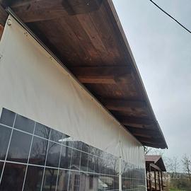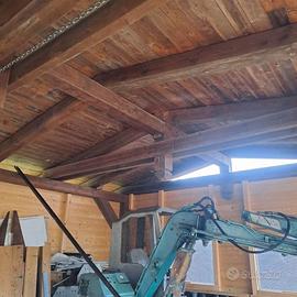Tettoia in legno usata chiusa sui lati uso ricovero attrezzi o altro , dimensioni Mt 7,50 x 5.60 H ,max Mt 3,70 H min Mt 3 ,l n 01 porta servizio luce 80 , n 04 finestre fisse punto luce , n 02 aperture frontali con telo e binario apribili misura luce cadauna Mt 3,43 x H 2,75 , struttura pesante in legno arice più tamponatura pareti laterali in legno abete . Vendo € 10000 trasporto e montaggio a parte , disponiamo di montatori per installazione . Per info 3.4.8.5.1.1.2.0.5.4.