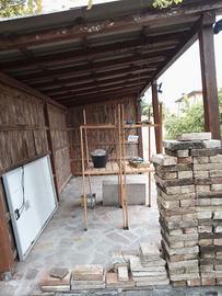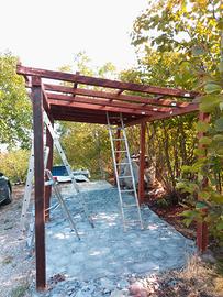 Tettoia legno larga 4,5 mt profonda 2,2 mt. L'altezza va da 2,4mt a 2,1mt adatta anche come gazebo. Su due lati ci sono i pannelli legno frangivento ( rimovibili . La struttura e' in legno principale e' in legno lamellare 10x10 i travetti sempre in lamellare 8x8 quindi molto robusta e solida . La tettoia è in buono stato generale