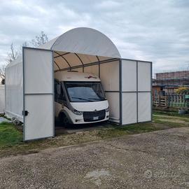 Vendo tettoia per camper o due auto o furgone con struttura in acciaio zincato a caldo completa di telo chiuso su quattro lati ma con porta in testa per ingresso e uscita. Telo da camion 800gr con poco più di un anno di vita. Dimensioni in pianta 8500*3500 con altezza di passaggio a 3300 ma tettoia alta 4400.Struttura verificata e collaudata con neve, tempesta grossa e vento. Vendo perchè costruisco in muratura. € 3900,00 indicativi. Visibile ancora montata ed eventualmente prenotabile Smontaggio e installazione da definire.(costa 1600 solo il telo) visibile ancora montata e prenotabile tel 335/6087233 e 342/9134665.