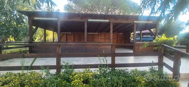 Struttura autoportante di 70 mq in legno massello impregnato, 10mt x 7mt, pilastri 16x10, travi tetto 20x10, tamponamenti con perline, recinzione esterna anteriore. La struttura e' stata appena smontata, presenti kit di montaggio e viti. Possibilita' di trasporto.