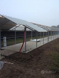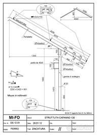 Moduli multipli di 4 metri composti da: 3 capriate tettoia in ferro zincato a caldo con 6 gambe, 6 pali in legno da 4 metri, 8 pannelli per tettoia sandwich isolanti, dello spessore di 3 cm, larghi 1 metro e lunghi 2,35 metri (lato esterno grecato in lamiera, lato interno in alluminio centesimale) Possibilità di vendita anche delle parti separate.