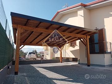 Completo di pilastri portanti, travi e morali con lavorazione ad incastro e lavorazione di palombelle finali, capitelli in legno massello, doghettato maschiettato, guaina ardesia, tutto il kit canala e le tegole con malta cementizia