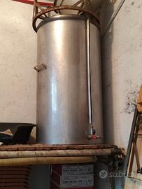 Tino in acciaio pesante da 300 litri munito di rubinetto, misuratore di livello liquidi, galleggiante, coperchio e treppiede in ferro per rialzo da terra. Adatto per fermentazione mosto, conservazione vino e opzionale per contenere liquidi in genere.