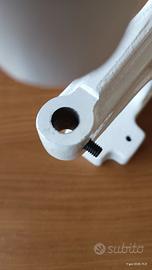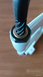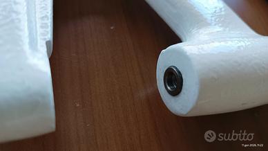 Torchietto mod. N. 3, bianco, con il braccetto a sbalzo, nuovo, mai usato. Foro di 12,2 mm, filetto superiore standard italiano. Filetto controllato, perfetto. Serve per chiudere bottoni automatici, forare pellame e tessuti tramite gli adeguati punzoni che però non vengono forniti con il torchietto. Dimensioni: esterne cm 21x8x31 h,gola cm 4,5x9, peso 4,1 kg.