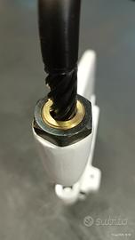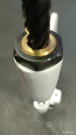 Torchietto mod. N. 3, bianco, con il braccetto a sbalzo, nuovo, mai usato. Foro di 12,2 mm, filetto superiore standard italiano. Filetto controllato, perfetto. Serve per chiudere bottoni automatici, forare pellame e tessuti tramite gli adeguati punzoni che però non vengono forniti con il torchietto. Dimensioni: esterne cm 21x8x31 h,gola cm 4,5x9, peso 4,1 kg.