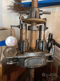 Vendo per inutilizzo questo torchio completo di martinetto idraulico. Capacità 500 litri circa, bacino in acciaio stampato con robusti rinforzi. Vite in acciaio ad alta à resistenza. Listelli della gabbia in legno di faggio evaporato, fissati con bulloni passanti. Pressione di esercizio 400 atmosfere. Usato pochissimo, in ottime condizioni.