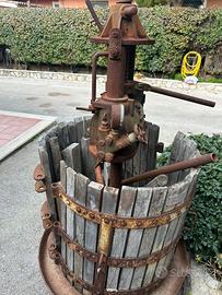 Antico torchio da vino manuale in legno e ferro. Struttura robusta con meccanismo a vite, bellissima patina del tempo che ne esalta il fascino rustico. Ideale come pezzo da collezione, arredo per cantina, agriturismo o ristorante. Oggetto autentico, raro e decorativo. Consegna a mano.