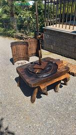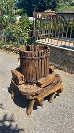 Antico torchio per uva manuale d’epoca, risalente ai primi anni del 1900, ben conservato e ideale per gli amanti della tradizione, del vino fatto in casa, collezionisti di oggetti d’epoca, esposizione, collezione o uso tradizionale.