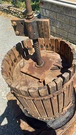 Modello raro composto da struttura totalmente in legno massello e parti meccaniche in ferro battuto e ghisa. Questo modello è una vera rarità, avendo anche la base e raccolta della spremitura in legno massello.