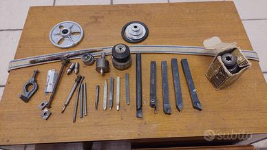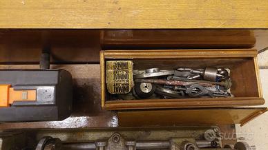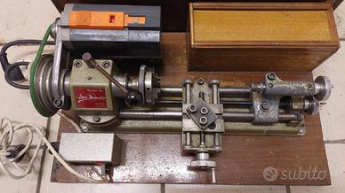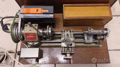 Tornio Emco Unimat SL perfettamente funzionante completo degli accessori presenti nella foto. Allo stesso è stato aggiunto un secondo interruttore, oltre all'originale, con variatore di velocità di rotazione. Inoltre è richiudibile tutto all'interno della sua scatola in legno.