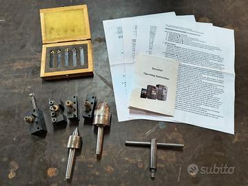 Torretta porta utensili a cambio rapido, contropunta rotante, mandrino, set utensili e manuale d'uso.