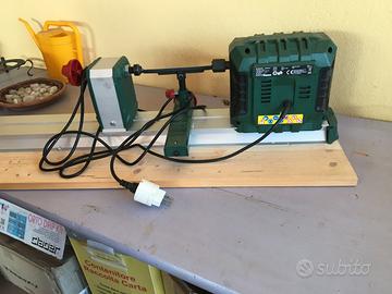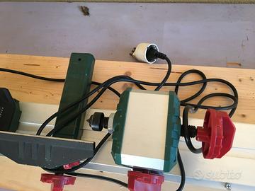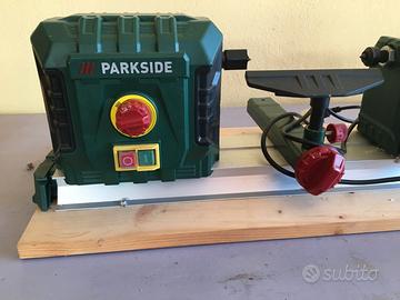 Tornio per legno PDM 600 C3 PARKSIDE, gia' montato su supporto di legno. Peso ca. 6 Kg. Numero di giri al minimo 800-3000 min. Lunghezza 97 cm. - larghezza 10 cm.