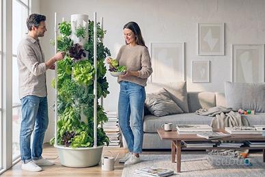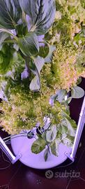 Il sistema funziona senza terra, con ricircolo continuo di acqua e nutrienti: consuma pochissimo (acqua e energia) ed è pratico anche per chi non ha esperienza.