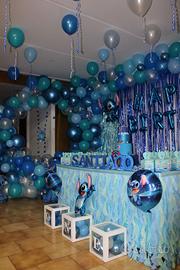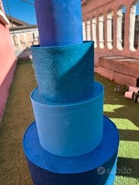 Torta finta in polistirolo blu da usare in decorazioni di festa per le foto. Sopra e ai lati si aggiunge la decorazione che si preferisce io l’avevo fatta di Stitch.