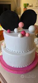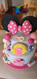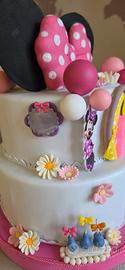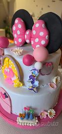 vendo torta compleanno in gomma. regalo anche decorazione per cerchio con minnie e paperina, bordo rosa in tulle per tavolo e festoni minnie
